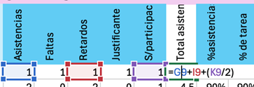 sacar el porcentaje de asistencias mediante la fórmula del total de